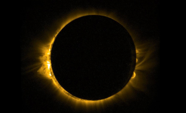Desde el espacio, satélites como Proba-2 de la Agencia Espacial Europea (ESA) han captado el espectáculo astronómico desde un lugar privilegiado. Este minisatélite ha usado su generador de imágenes SWAP para grabar a la Luna pasando por delante del Sol. El instrumento SWAP observa el disco solar en longitudes de onda del ultravioleta extremo, detectando la turbulenta superficie del Sol y su corona.