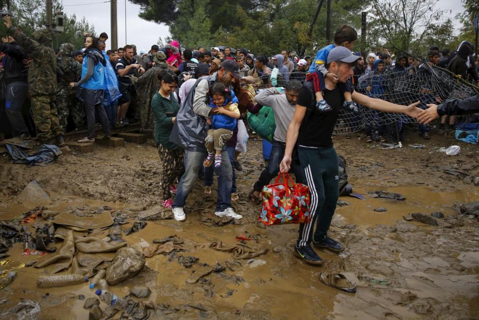 • Refugiados sirios caminan por el barro mientras cruzan la frontera de Grecia a Macedonia, cerca de la localidad griega de Idomeni, 10 de septiembre de 2015- REUTERS, Yannis Behrakis