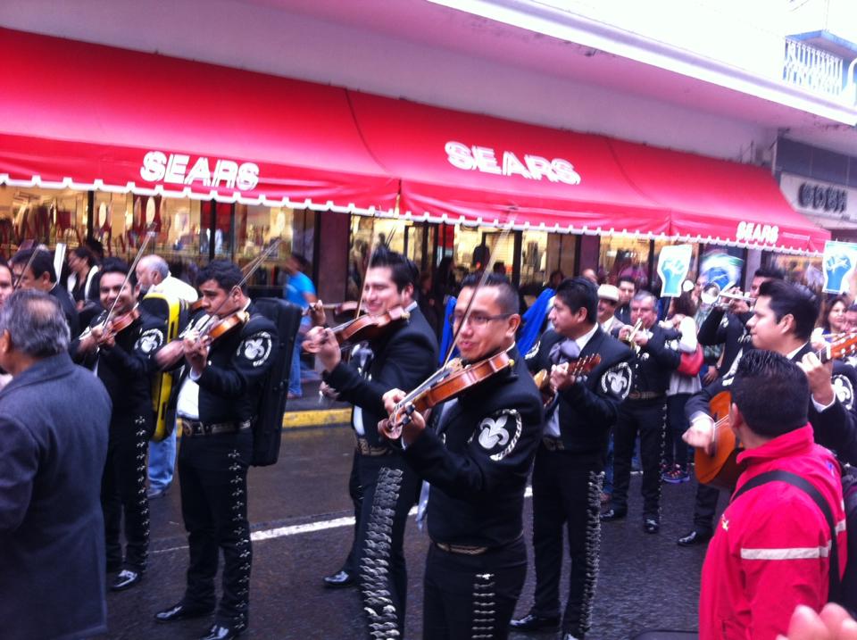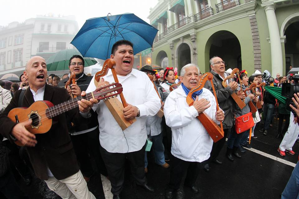 La orquesta de Moscovita, con su composición “La universidad no se toca”, haciéndola sonar en el zócalo de Veracruz, con bailarines de son jarocho moviéndose a su ritmo, con instrumentos agregados de los otros grupos musicales.